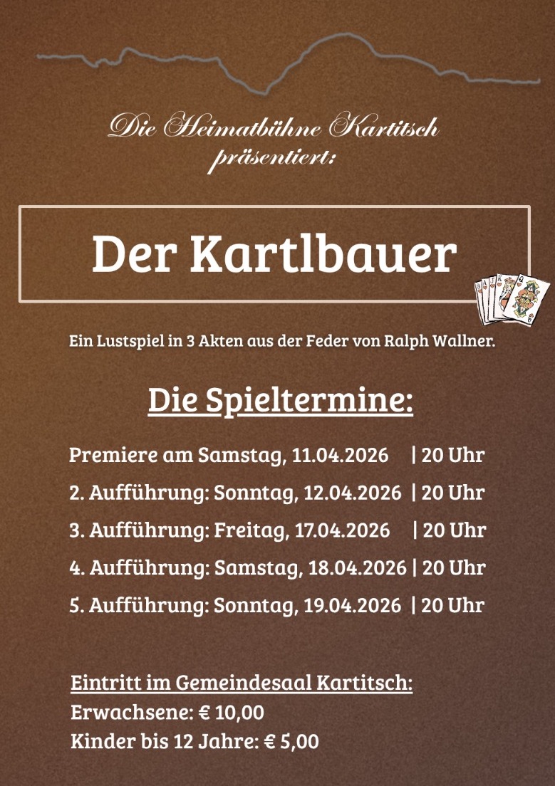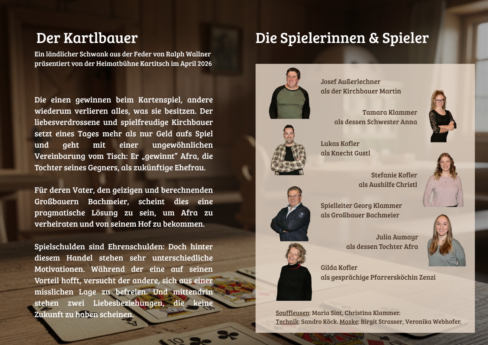 Premiere feiert das Stück am Samstag den 11.04.2026 um 20:00 Uhr im Gemeindesaal Kartitsch.